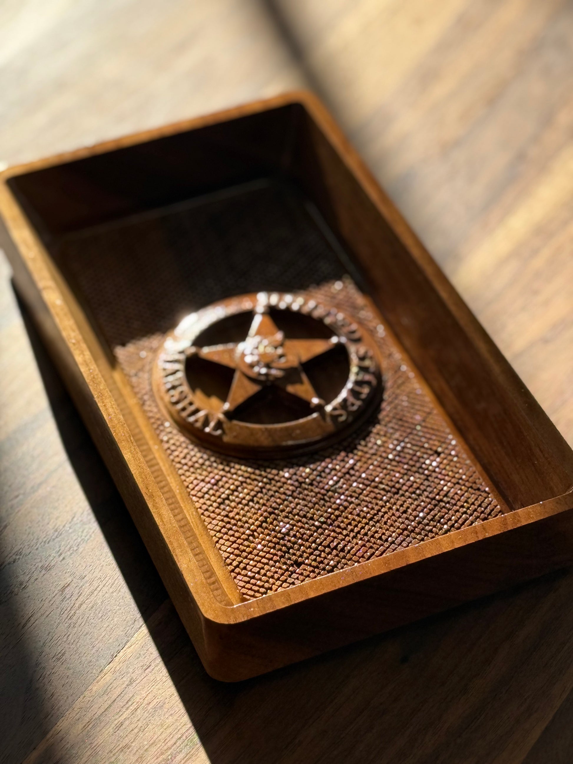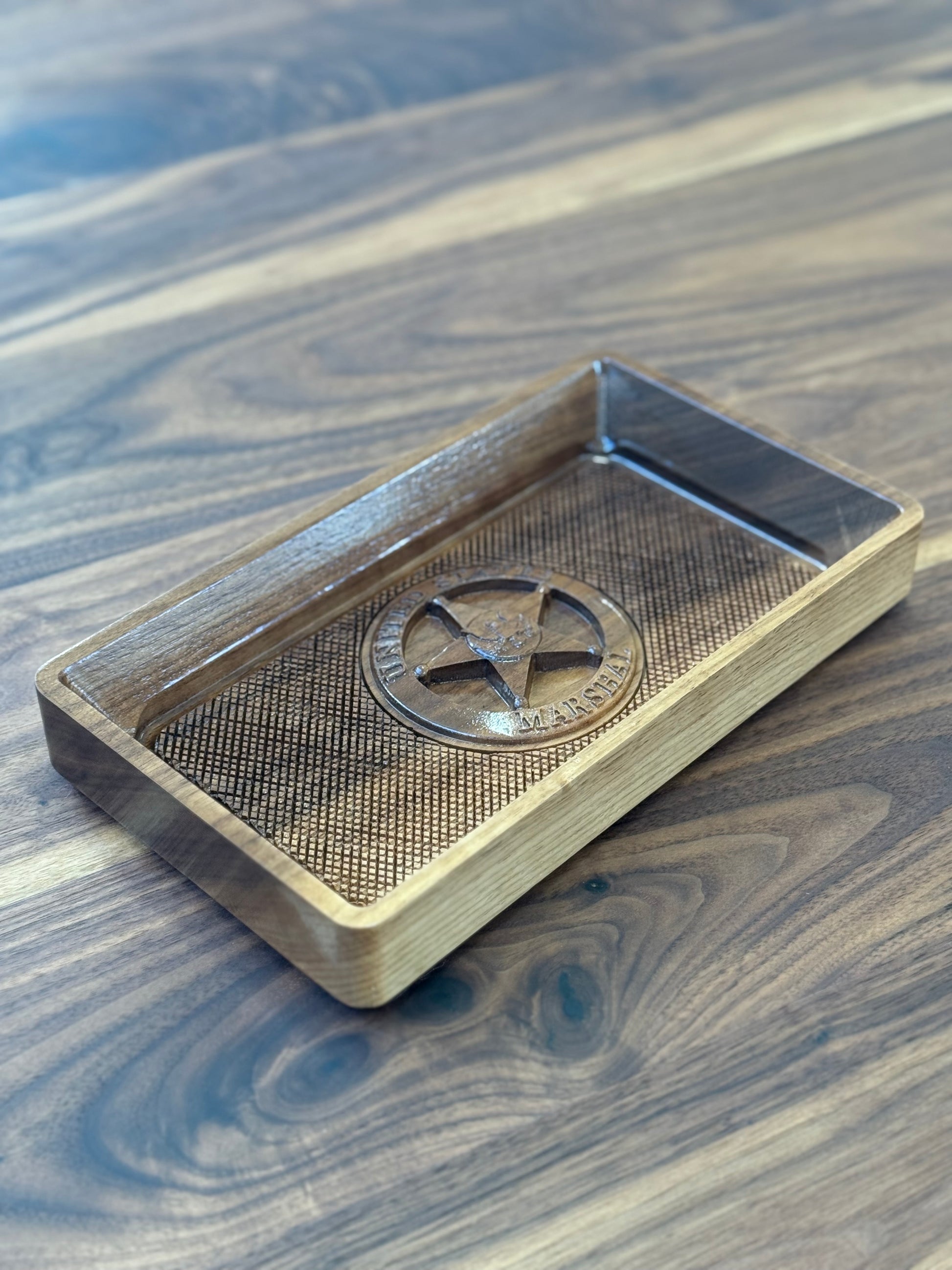Enhance your organization and style with our Custom Drop Trays with 3D Carving. Made from Black Walnut and featuring personalized engravings, this tray is perfect for storing daily essentials. The 3D carving adds a unique touch while the personalization allows for an individualized touch. Perfect for any space in need of functionality and personalization. Let’s collaborate on a one of a kind piece.