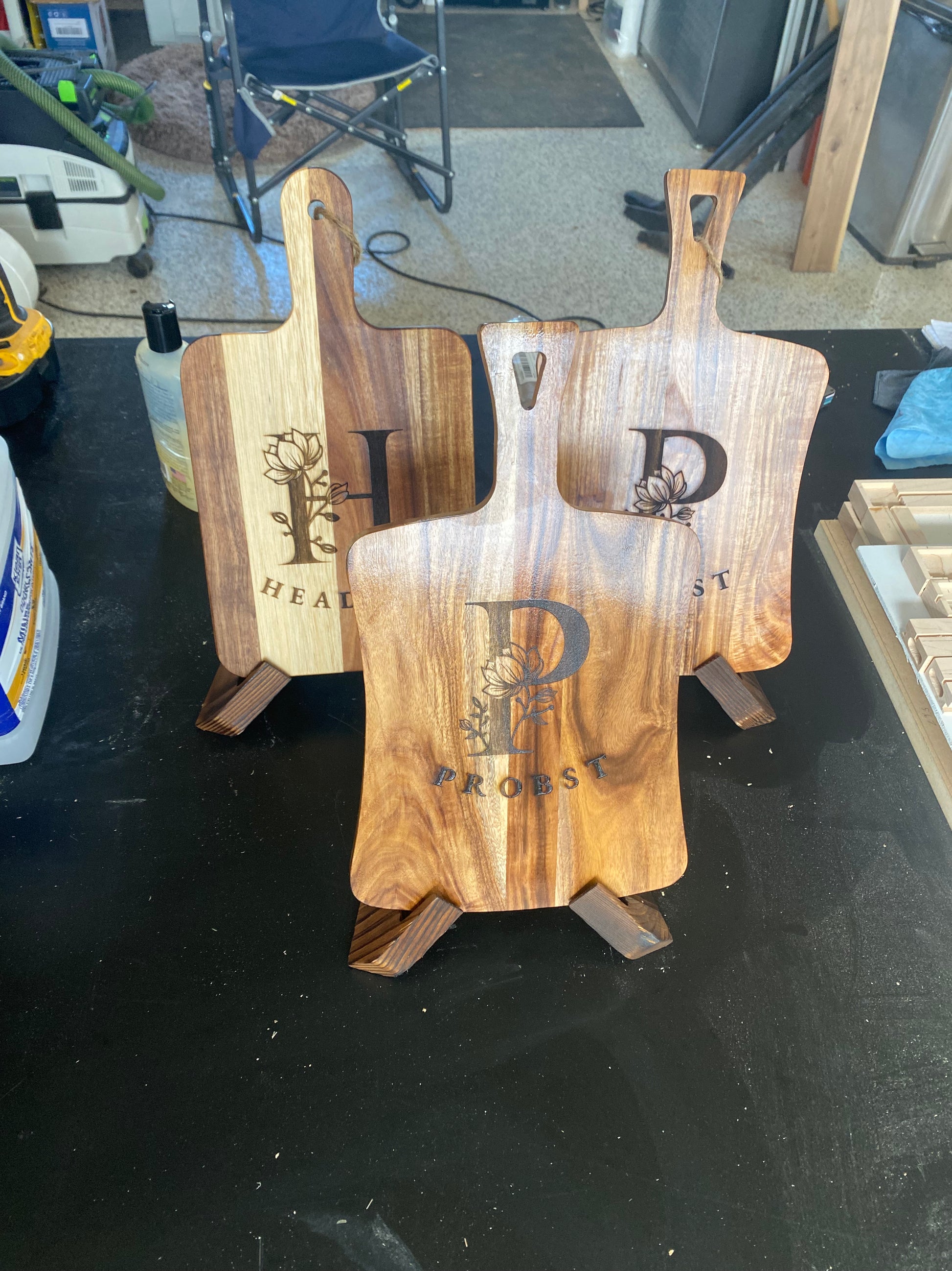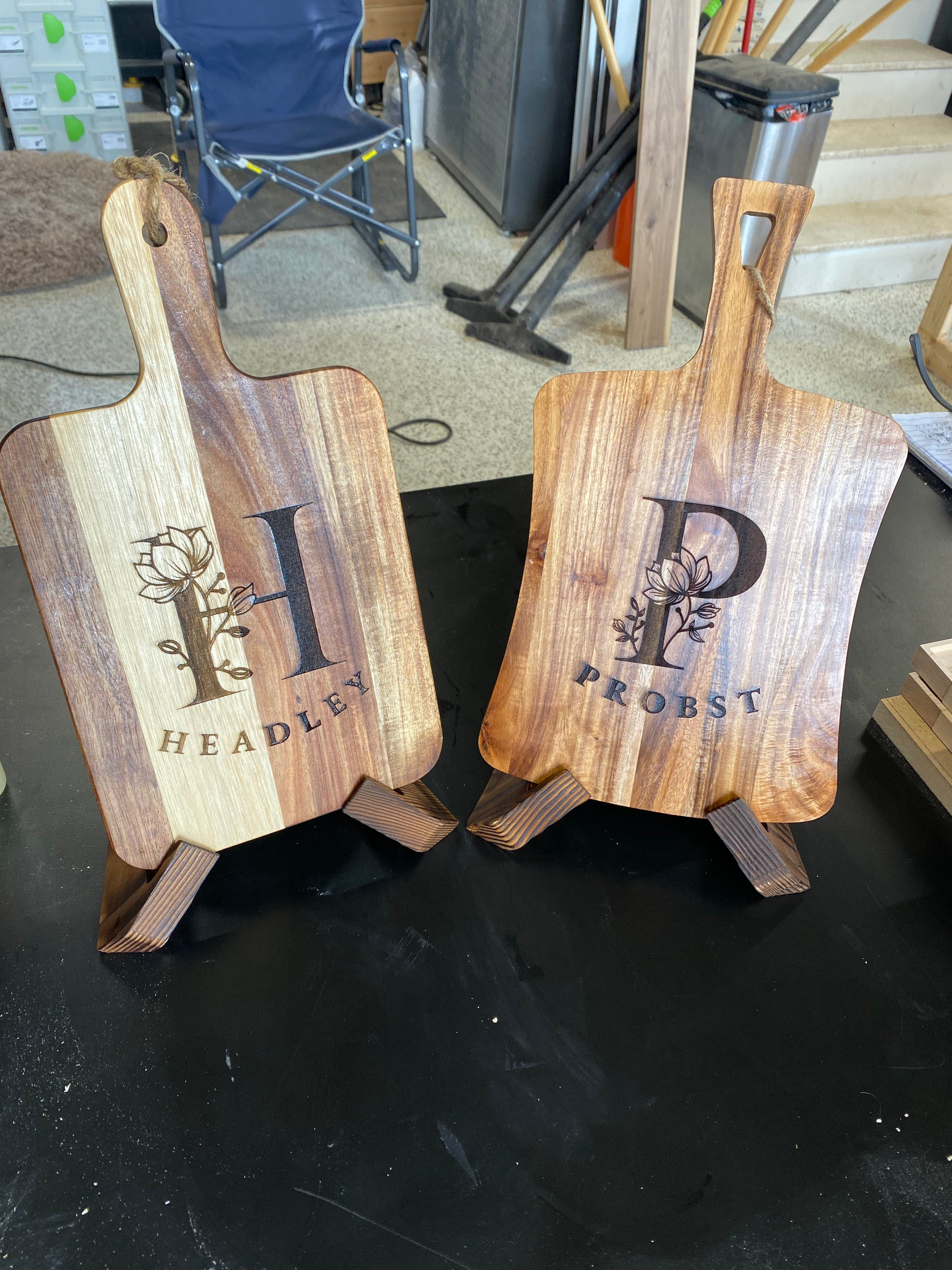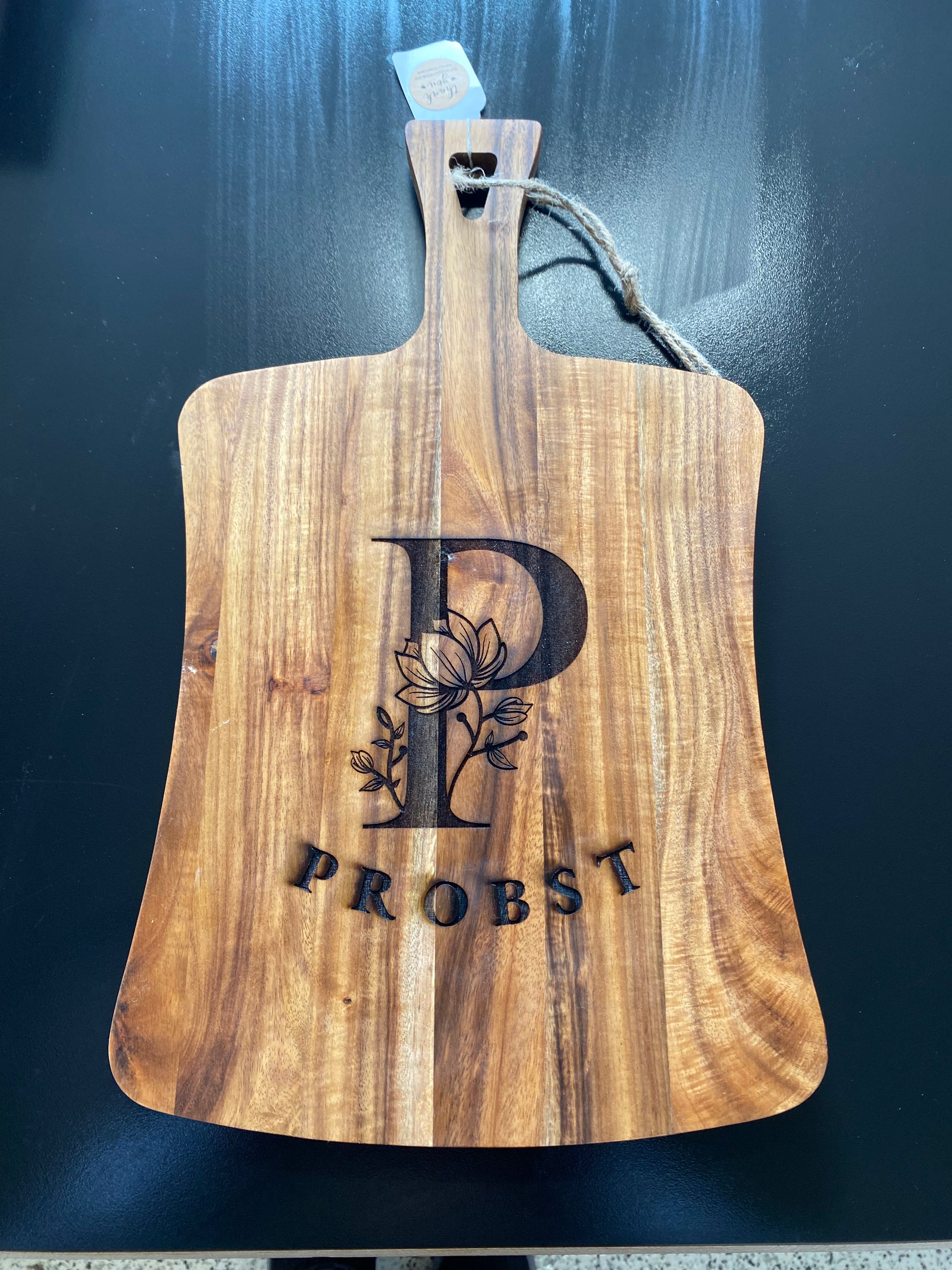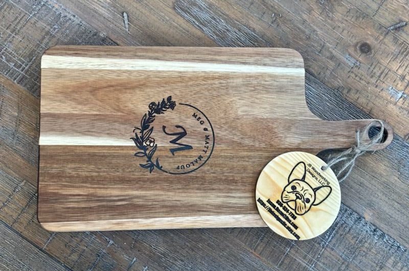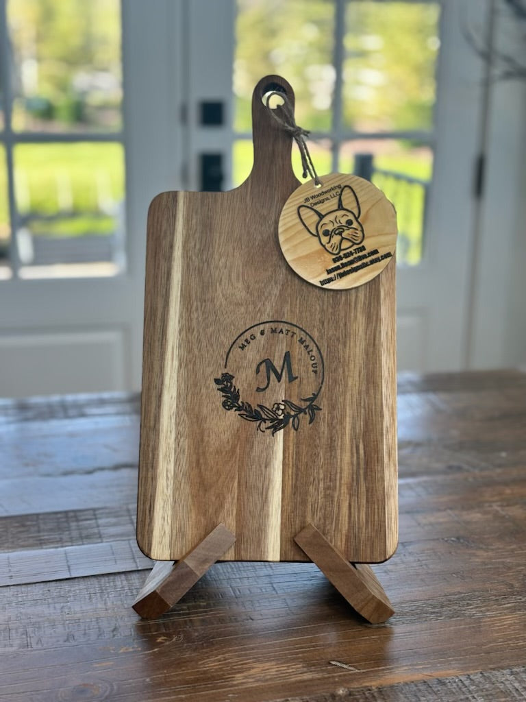 Custom and personalized Acacia hardwood serving tray, cheese tray, charcuterie board, chopping board. I will laser engrave this piece to meet your expectations. Finished with tung oil or mineral oil and beeswax for a food safe finish. Rubber feet attached to ease handling. Approximately 17”L X 9”W X 1”D